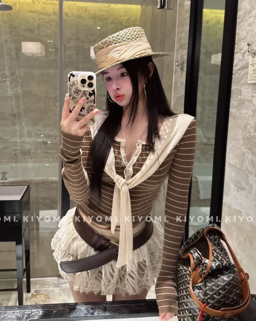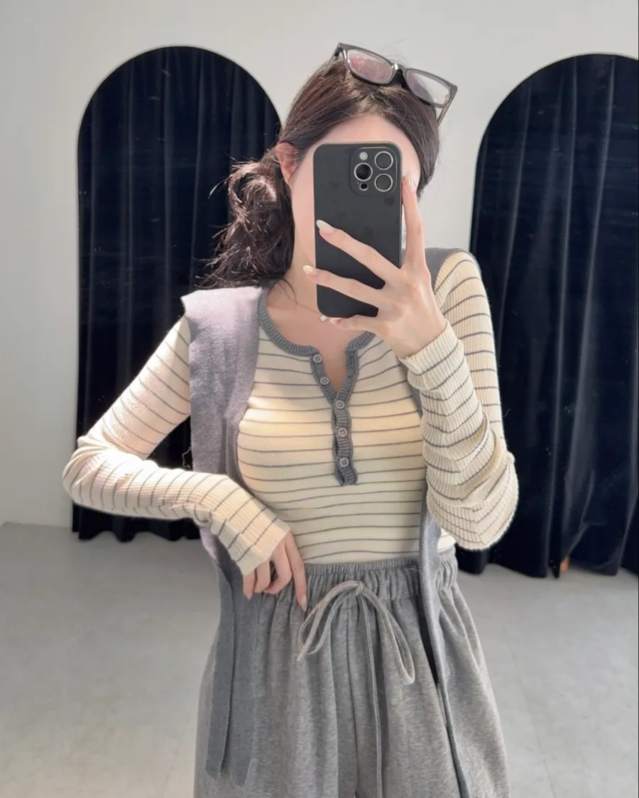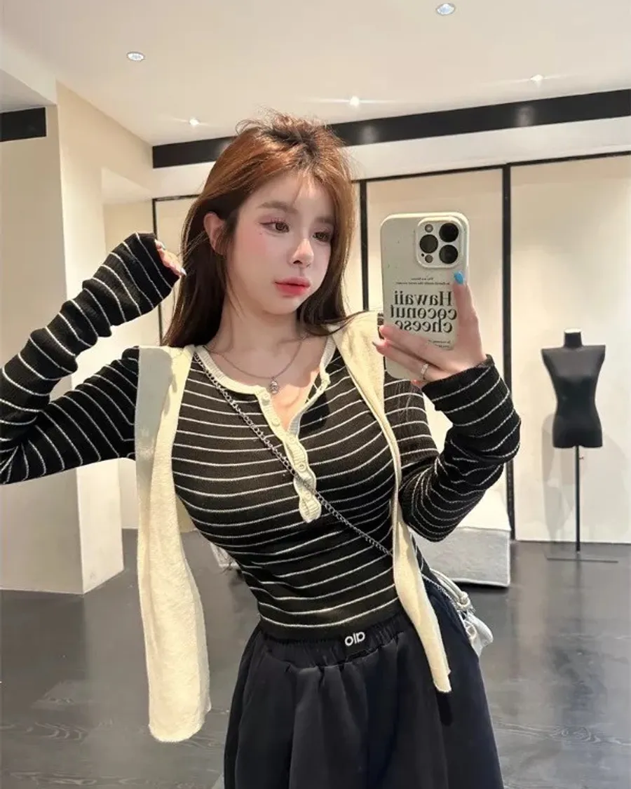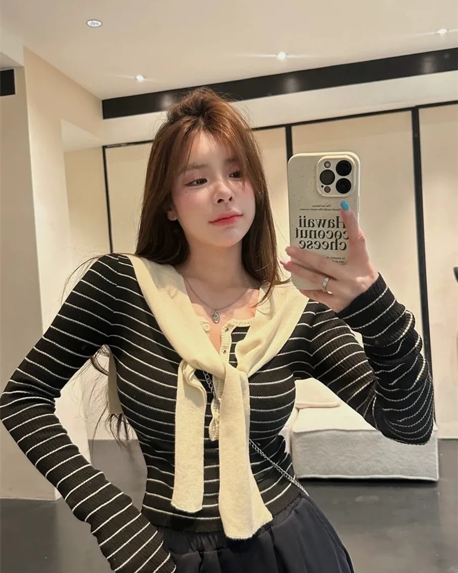 現貨 – 條紋披肩假兩件式上衣